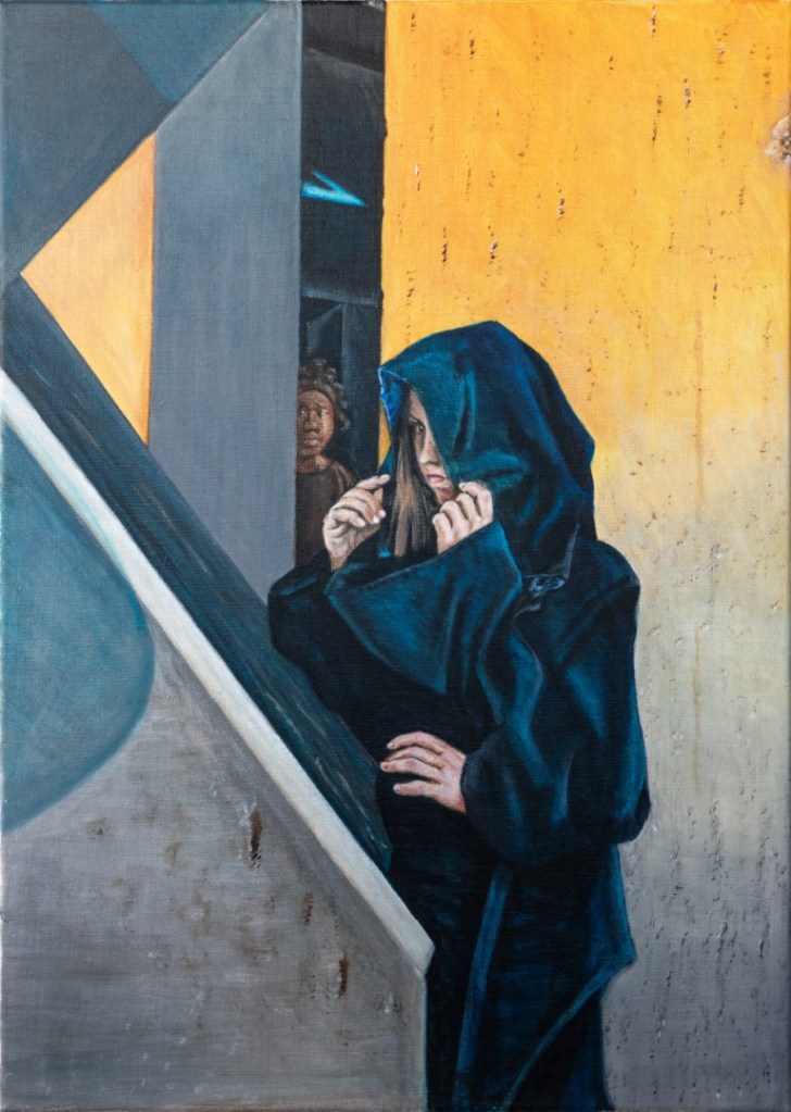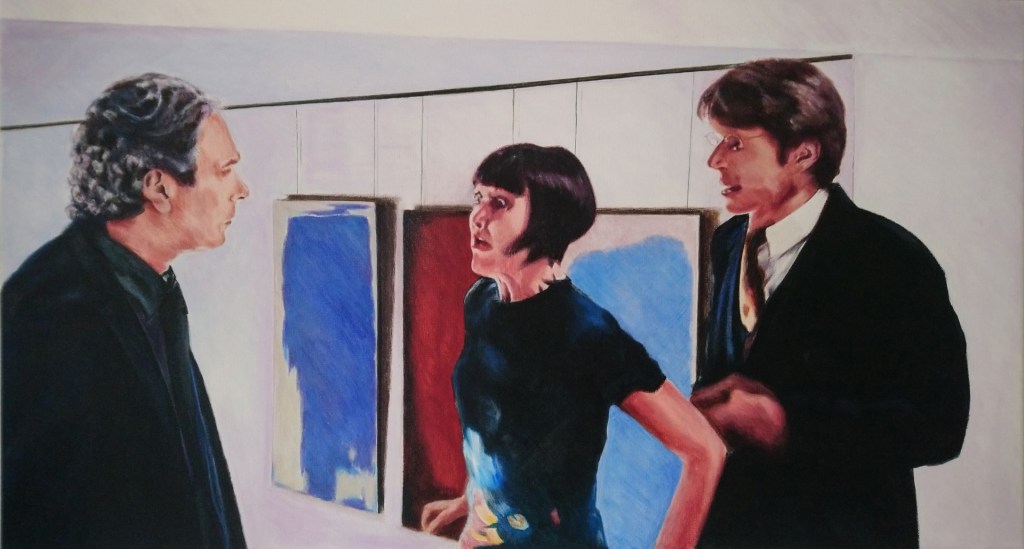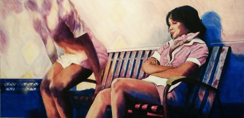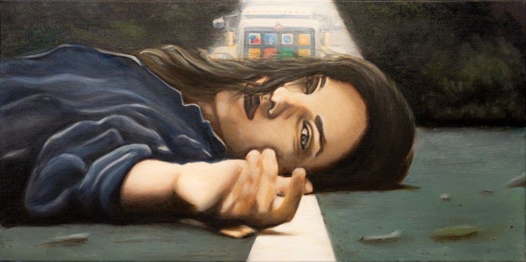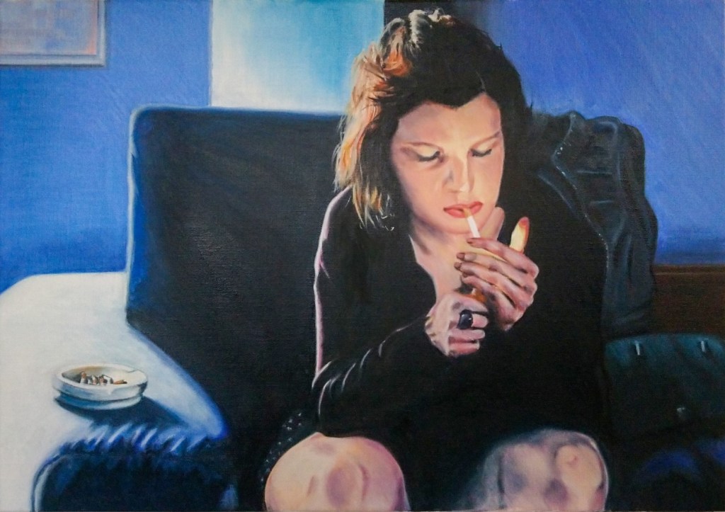 Vandaag schilder ik op doek, in acryl of olieverftechniek. Ik kies mijn onderwerpen meestal op basis van beelden die iedereen wel kan plaatsen. Soms uit het eigen dagelijks leven, maar ook uit de media, zoals filmstills. Door kleur of compositie en door toevoeging of weglating van elementen werkt het beeld vaak bevreemdend, wat de kijker triggert om naar de achterliggende gedachte op zoek te gaan. Elkeen kan het beeld vertalen naar zijn eigen situatie en er zijn eigen verhaal rond bouwen...